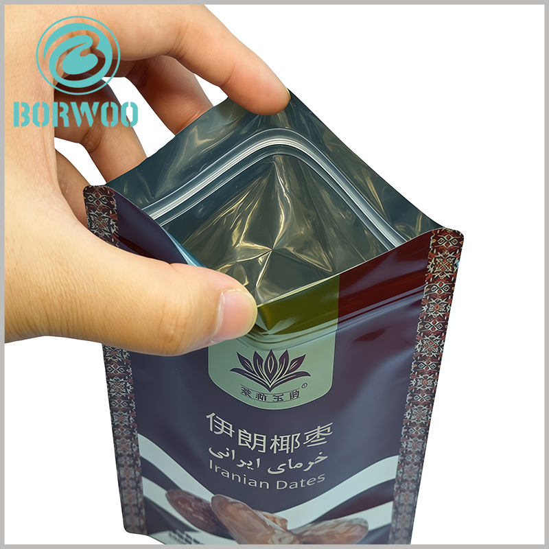 Engineered for practicality and retail appeal, the sturdy stand-up base (168×88mm) ensures pouches stay securely upright on shelves, maximizing visibility and minimizing aisle clutter. Equipped with a resealable zipper closure and optional clear window panel , the pouch offers convenient repeated access for consumers while showcasing the dates’ plump, natural appearance—boosting retail conversion.